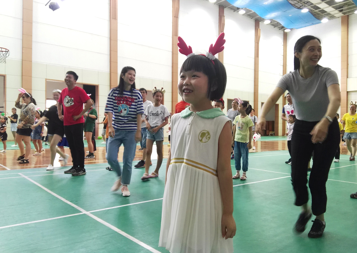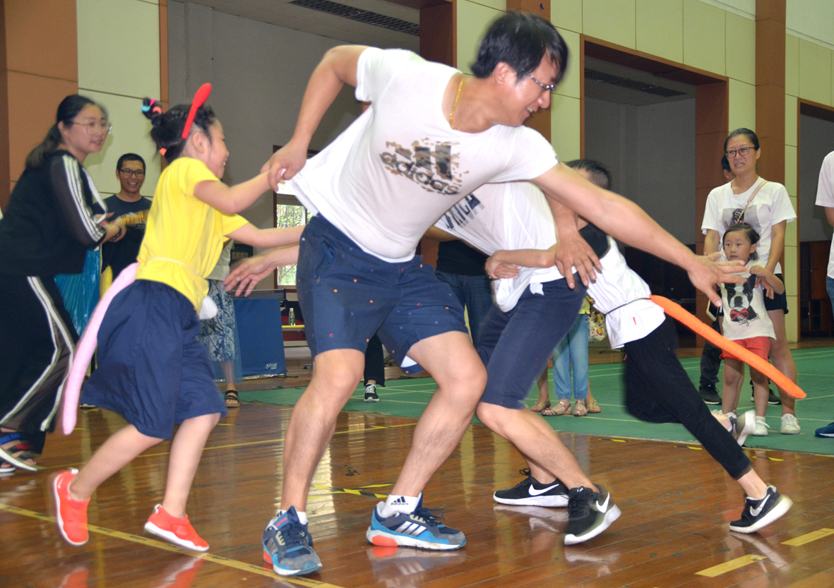 兩人三足、猴子倒掛、踩石頭過河、耳語傳話、揪尾巴、小小纖夫……在快節奏的生活中,難得的親子趣味運動時光讓江山股份文體活動中心充滿了歡聲笑語。