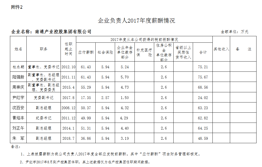 南通產業控股集團有限公司2017年度薪酬信息披露公告