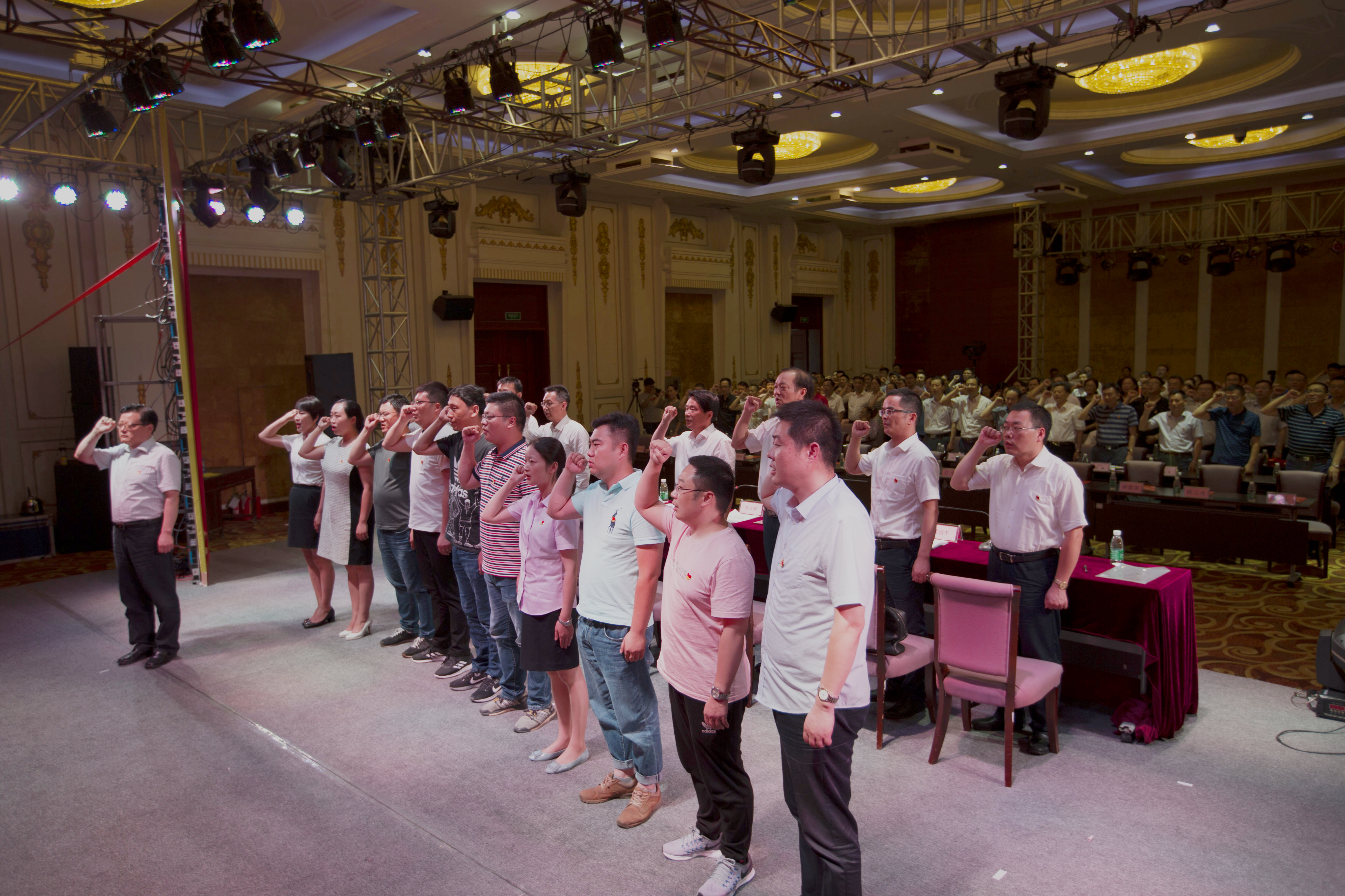 產控集團黨委副書記、副董事長、總經理陸強新帶領新黨員進行入黨宣誓儀式,全體與會黨員莊嚴起立,舉起右拳,重溫入黨誓詞。